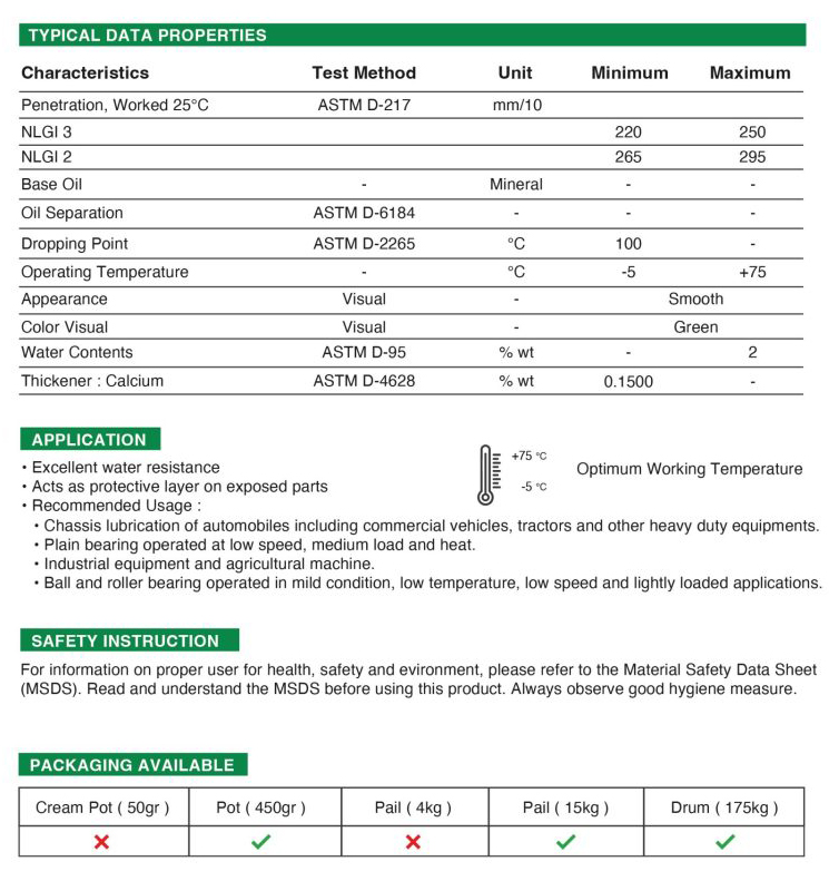 CHAMPOIL HEAVY LOADER Calcium Chassis Grease / Stempet, GSP / Light Green MP / Multipurpose (-5°C to 70°C), CHAMPOIL HEAVY LOADER Chassis Grease GSP (-5°C to 70°C) is made using high quality materials with calcium thickener (soap) with a minimum melting point of 100°C. CHAMPOIL HEAVY LOADER Chassis Grease GSP protects rubbing parts and prevents rust. Reinforced with adhesion enhancing additives so that it can work well on rough surfaces.